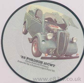 Vinyl Single picture disc, showing a '55 Fordson van with supercharged V6 (actually a Thames).
