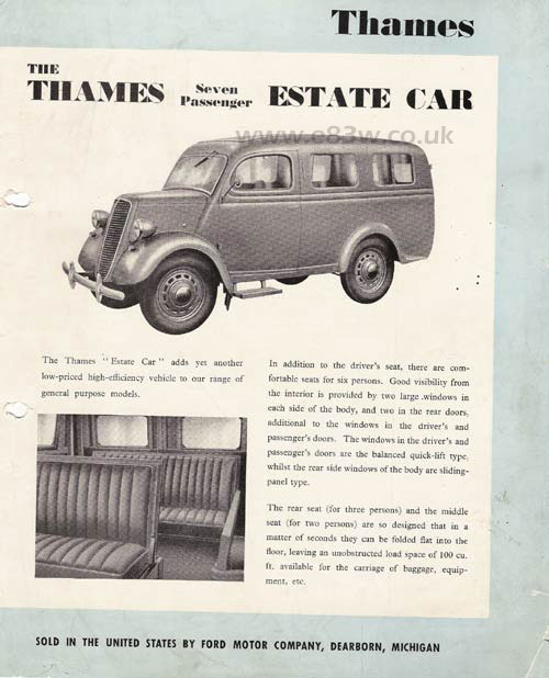 USA issue single sheet for the 7 passenger Thames Estate Car E83W, published in 1950. Note export style front parking lights and overriders.